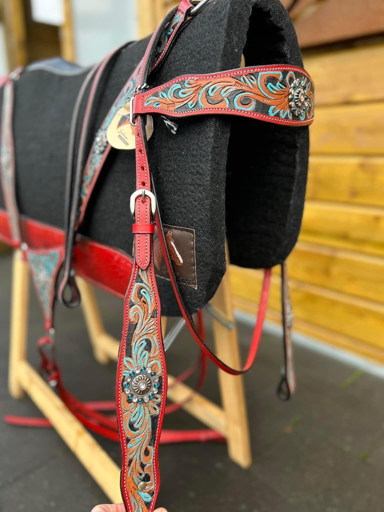 Complete red tack set in size Full/XFull (ajustible)! Also matching pad with red leader.