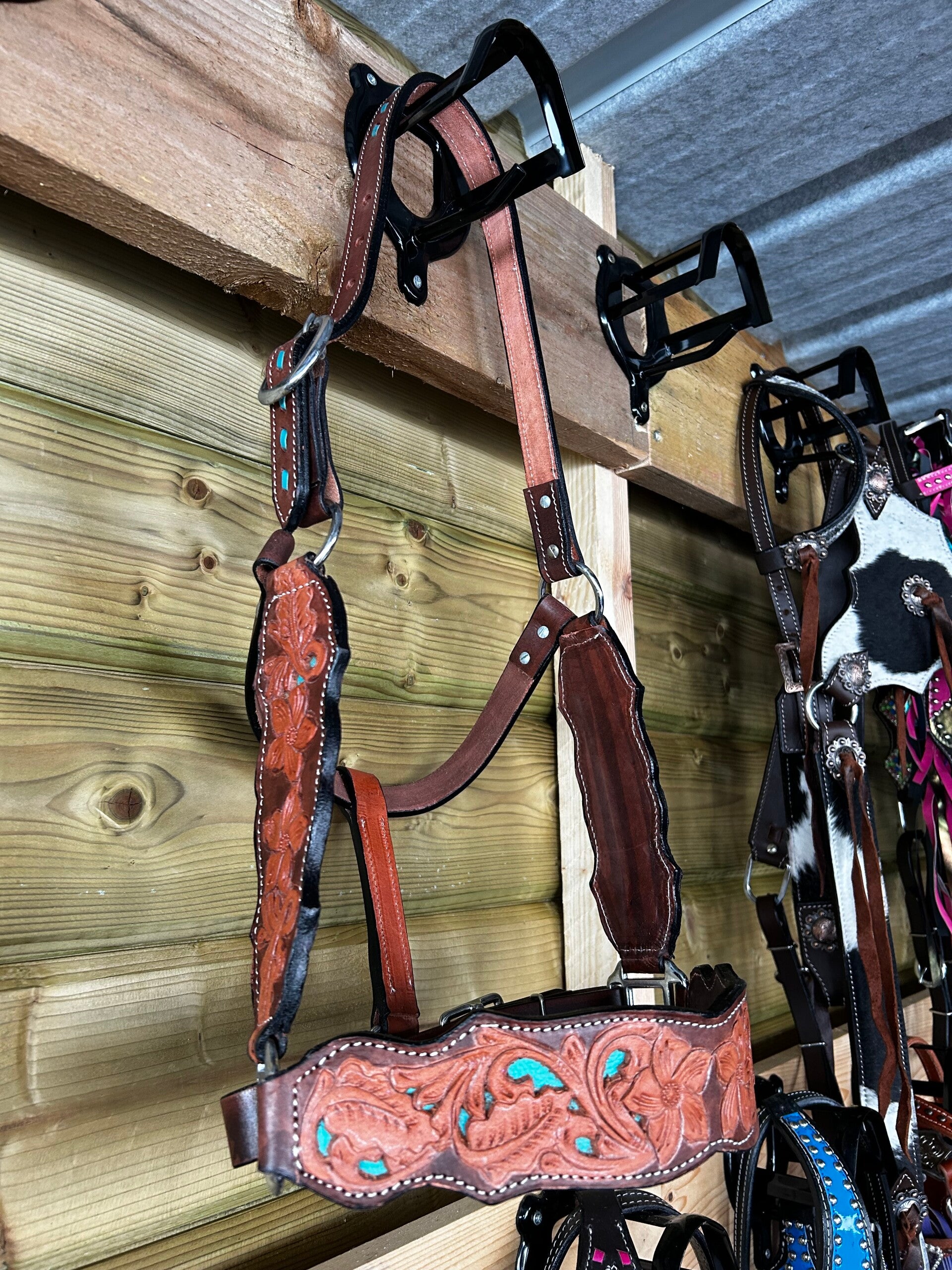 Full/XFull leather halter with turquoise tooling.
